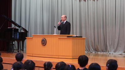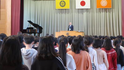 始業式後には、生徒指導担当の先生からの、1月の生活目標「あいさつでいっぱいにしよう」の話がありました。相手意識をもって、ちょうどいい声の大きさで、あいさつをすること、また、凡事徹底ということで、名札と靴そろえを意識することについての話でした。