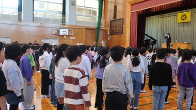 はじめに、校長先生からお話がありました。「今年は午(うま)年です。馬は前へ前へ進みます。みなさんも、目標を立て、それに向かって努力を続け、3学期が終わった時には、頑張ったと思えるようにしましょう。」というお話がありました。