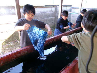 藍染体験では、水や藍染の「冷たさ」を感じながら、ハンカチを作り、友達と比べ合っていました。