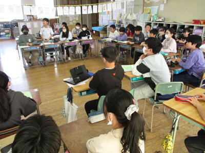 5年生の学級活動です。学級の企画「思い出振り返り会をしよう」の内容を話し合って決めています。5年生らしく、話し合いの内容も様々な角度からよく考えて発言をしています。