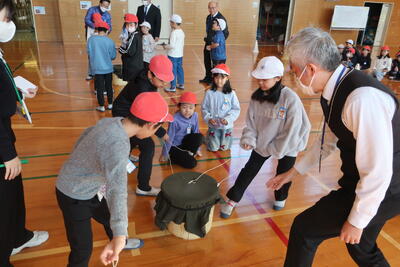 12月5日(金)の5・6時間目にベーゴマ大会を行いました。「もっとベーゴマが好きになるように大会をしよう」をめあてとして、まずはとこの上(ベーゴマを回す台)で回せるように頑張りました。クラスごとにA、B、Cに分かれて、それぞれで戦いました。各グループで3クラスが戦い、勝ったクラスに1点を入れて集計をしていきました。結果は1組9点、2組9点、3組9点となり、すべてのクラスが同じ点数となり、3クラスとも優勝となりました。大会の後は、子供対大人で対戦を行い、ベーゴマ同士がぶつかり合い、白熱した戦いとなりました。子供達もとても盛り上がっており、ベーゴマに夢中になっていました。