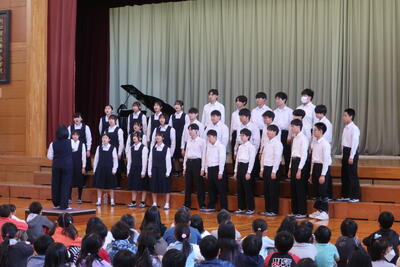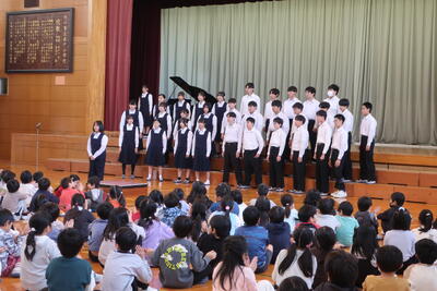 中学生の歌声は、とても素晴らしく、迫力ある女性と男性の声に、舟戸っ子のみんなも引き付けられていました。全体で歌ったり、デュエット部分があったり、心に響く演奏でした。演奏後には、自然と拍手が起きていました。