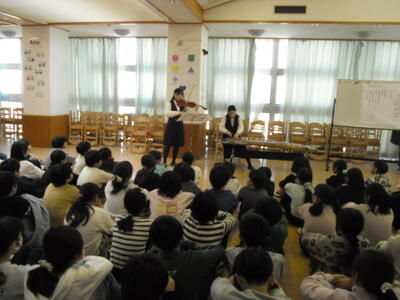 5年生 箏 演奏会 投稿: 舟戸小学校 (15:35) 東京藝術大学附属音楽高等学校生田流箏曲専攻の横田菫さん、バイオリン専攻の宮澤理奈子さんが来てくださいました。 5年生の音楽で学習した「春の海」の演奏に感動していました。今回はバイオリンと箏という珍しい組み合わせの演奏を聞くことができました。 「ワンワン ニャオニャオ」に合わせて楽しそうに歌う子ども達の姿が見られました。